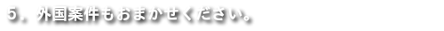 - 市場はますますグローバル化しており、日本の市場が縮小している中、外国に市場を求めることが一般的になってきています。外国への出願は、日本の特許事務所と当該外国の特許事務所が連携して対応するのがごく一般的です。当所は、米国、欧州、アジア、オセアニア等、外国案件も得意としております。
