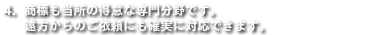 - 商標は、営業主体や商品・サービスの顔であり、非常に重要です。特に商標の場合は、遠方のお客様に対しましても、直接面談することなく、電話、ファクシミリ、電子メール等でも十分な対応をすることができます。実際に、北海道、東京、関西、九州等からもご依頼を頂いております。「愛・地球博」(愛知万博)の商標も数多く当所が担当させて頂きました。