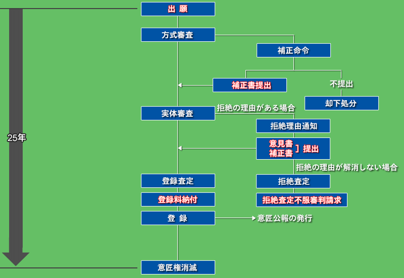 また、特許庁に対して意匠登録出願をしてから登録に至るまでの流れを示す図も添付しましたので、ご参照下さい。